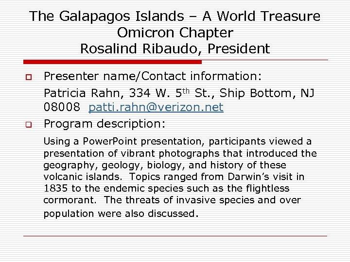 The Galapagos Islands – A World Treasure Omicron Chapter Rosalind Ribaudo, President o q Presenter name/Contact information: Patricia Rahn, 334 W. 5 th St. , Ship Bottom, NJ 08008 patti. rahn@verizon. net Program description: Using a Power. Point presentation, participants viewed a presentation of vibrant photographs that introduced the geography, geology, biology, and history of these volcanic islands. Topics ranged from Darwin’s visit in 1835 to the endemic species such as the flightless cormorant. The threats of invasive species and over population were also discussed.