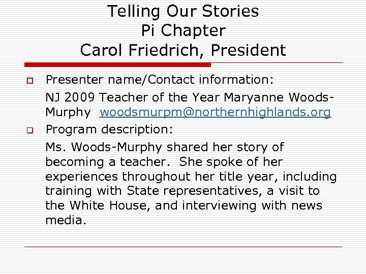 Telling Our Stories Pi Chapter Carol Friedrich, President o q Presenter name/Contact information: NJ 2009 Teacher of the Year Maryanne Woods. Murphy woodsmurpm@northernhighlands. org Program description: Ms. Woods-Murphy shared her story of becoming a teacher. She spoke of her experiences throughout her title year, including training with State representatives, a visit to the White House, and interviewing with news media.