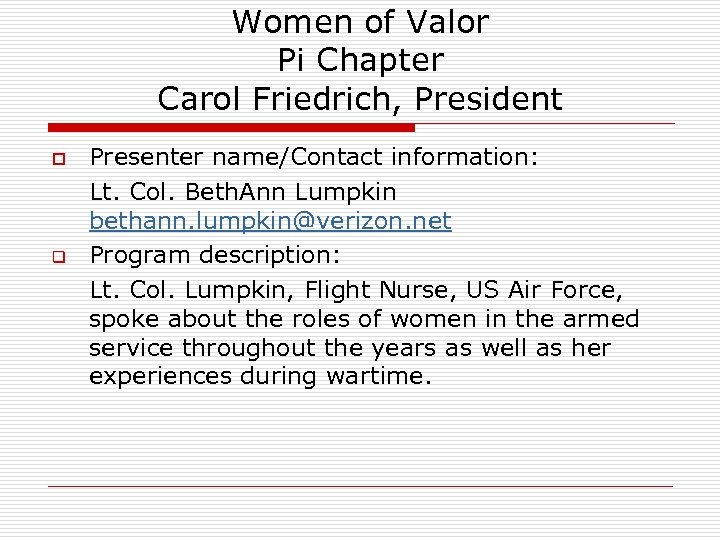 Women of Valor Pi Chapter Carol Friedrich, President o q Presenter name/Contact information: Lt. Col. Beth. Ann Lumpkin bethann. lumpkin@verizon. net Program description: Lt. Col. Lumpkin, Flight Nurse, US Air Force, spoke about the roles of women in the armed service throughout the years as well as her experiences during wartime.