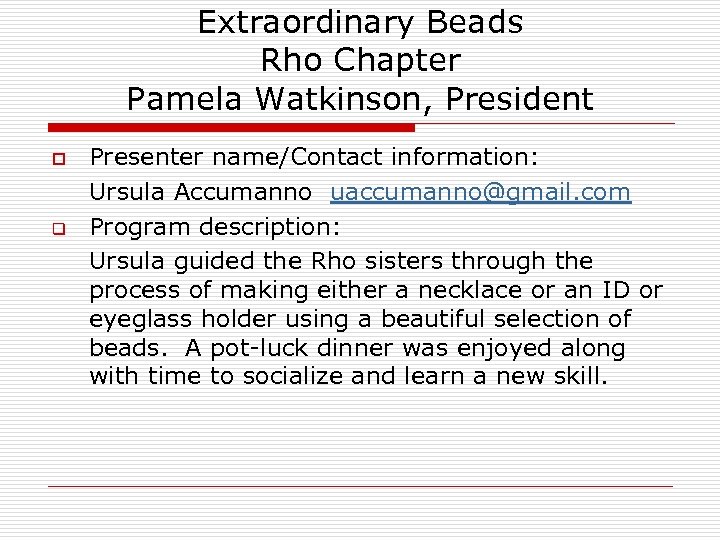 Extraordinary Beads Rho Chapter Pamela Watkinson, President o q Presenter name/Contact information: Ursula Accumanno uaccumanno@gmail. com Program description: Ursula guided the Rho sisters through the process of making either a necklace or an ID or eyeglass holder using a beautiful selection of beads. A pot-luck dinner was enjoyed along with time to socialize and learn a new skill.