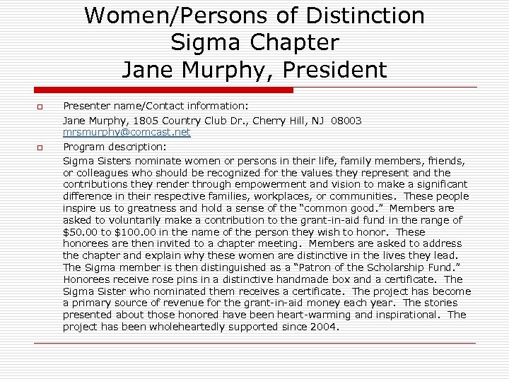 Women/Persons of Distinction Sigma Chapter Jane Murphy, President o q Presenter name/Contact information: Jane Murphy, 1805 Country Club Dr. , Cherry Hill, NJ 08003 mrsmurphy@comcast. net Program description: Sigma Sisters nominate women or persons in their life, family members, friends, or colleagues who should be recognized for the values they represent and the contributions they render through empowerment and vision to make a significant difference in their respective families, workplaces, or communities. These people inspire us to greatness and hold a sense of the “common good. ” Members are asked to voluntarily make a contribution to the grant-in-aid fund in the range of $50. 00 to $100. 00 in the name of the person they wish to honor. These honorees are then invited to a chapter meeting. Members are asked to address the chapter and explain why these women are distinctive in the lives they lead. The Sigma member is then distinguished as a “Patron of the Scholarship Fund. ” Honorees receive rose pins in a distinctive handmade box and a certificate. The Sigma Sister who nominated them receives a certificate. The project has become a primary source of revenue for the grant-in-aid money each year. The stories presented about those honored have been heart-warming and inspirational. The project has been wholeheartedly supported since 2004.