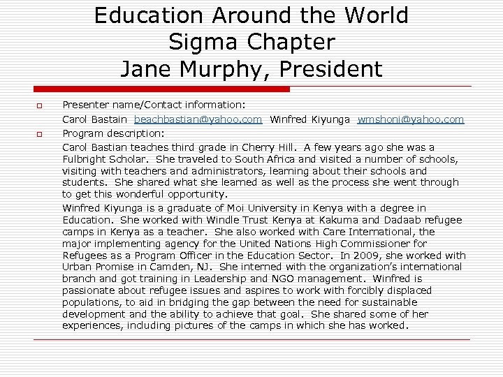 Education Around the World Sigma Chapter Jane Murphy, President o q Presenter name/Contact information: Carol Bastain beachbastian@yahoo. com Winfred Kiyunga wmshoni@yahoo. com Program description: Carol Bastian teaches third grade in Cherry Hill. A few years ago she was a Fulbright Scholar. She traveled to South Africa and visited a number of schools, visiting with teachers and administrators, learning about their schools and students. She shared what she learned as well as the process she went through to get this wonderful opportunity. Winfred Kiyunga is a graduate of Moi University in Kenya with a degree in Education. She worked with Windle Trust Kenya at Kakuma and Dadaab refugee camps in Kenya as a teacher. She also worked with Care International, the major implementing agency for the United Nations High Commissioner for Refugees as a Program Officer in the Education Sector. In 2009, she worked with Urban Promise in Camden, NJ. She interned with the organization’s international branch and got training in Leadership and NGO management. Winfred is passionate about refugee issues and aspires to work with forcibly displaced populations, to aid in bridging the gap between the need for sustainable development and the ability to achieve that goal. She shared some of her experiences, including pictures of the camps in which she has worked.