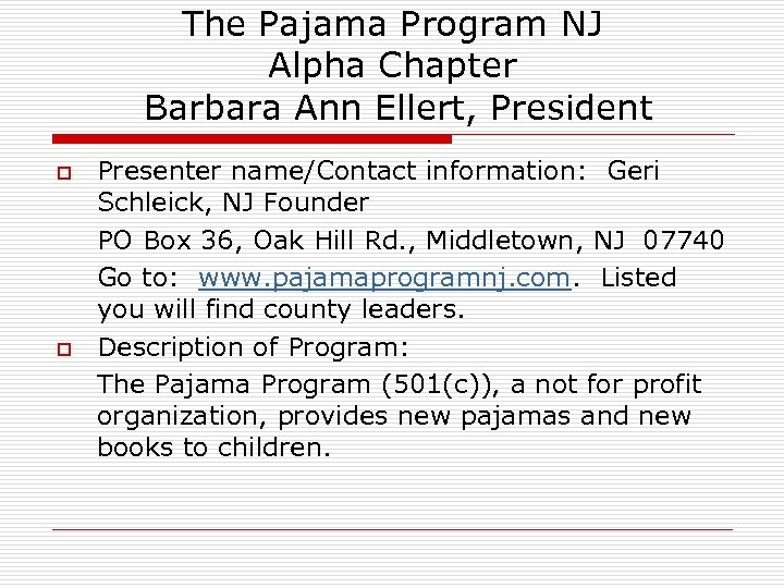 The Pajama Program NJ Alpha Chapter Barbara Ann Ellert, President o o Presenter name/Contact information: Geri Schleick, NJ Founder PO Box 36, Oak Hill Rd. , Middletown, NJ 07740 Go to: www. pajamaprogramnj. com. Listed you will find county leaders. Description of Program: The Pajama Program (501(c)), a not for profit organization, provides new pajamas and new books to children.
