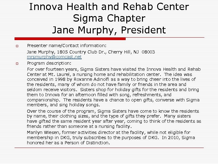 Innova Health and Rehab Center Sigma Chapter Jane Murphy, President o q Presenter name/Contact information: Jane Murphy, 1805 Country Club Dr. , Cherry Hill, NJ 08003 mrsmurphy@comcast. net Program description: For over fourteen years, Sigma Sisters have visited the Innova Health and Rehab Center at Mt. Laurel, a nursing home and rehabilitation center. The idea was conceived in 1998 by Roxanne Adinolfi as a way to bring cheer into the lives of the residents, many of whom do not have family or friends in the area and seldom receive visitors. Sisters shop for holiday gifts for the residents and bring them to Innova for an afternoon filled with song, refreshments, and companionship. The residents have a chance to open gifts, converse with Sigma members, and sing holiday songs. Over the course of the program, Sigma Sisters have come to know the residents by name, their clothing sizes, and the type of gifts they prefer. Many sisters have gifted the same resident year after year, coming to think of the residents as friends rather than someone at a nursing facility. Marilyn Wiesen, former activities director at the facility, while not eligible for membership in DKG, truly subscribes to the purposes of DKG. In 2010, Sigma honored her as a Person of Distinction.