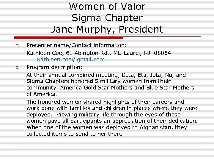 Women of Valor Sigma Chapter Jane Murphy, President o q Presenter name/Contact information: Kathleen Coe, 61 Abington Rd. , Mt. Laurel, NJ 08054 Kathleen. coe@gmail. com Program description: At their annual combined meeting, Beta, Eta, Iota, Nu, and Sigma Chapters honored 5 military women from their community, America Gold Star Mothers and Blue Star Mothers of America. The honored women shared highlights of their careers and work done with families and children in places where they were deployed. Viewing military life through the eyes of these women gave all participants an appreciation of their dedication. When one of the women was deployed to Afghanistan, they collected items to send to her there.