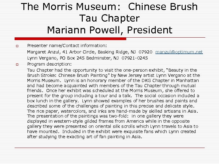 The Morris Museum: Chinese Brush Tau Chapter Mariann Powell, President o q Presenter name/Contact information: Margaret Anzul, 41 Arbor Circle, Basking Ridge, NJ 07920 manzul@optimum. net Lynn Vergano, PO Box 245 Bedminster, NJ 07921 -0245 Program description: Tau Chapter had the opportunity to visit the one-person exhibit, “Beauty in the Brush Stroke: Chinese Brush Painting” by New Jersey artist Lynn Vergano at the Morris Museum. Lynn is an honorary member of the DKG Chapter in Manhattan and had become acquainted with members of the Tau Chapter through mutual friends. Once her exhibit was scheduled at the Morris Museum, she offered to present for the group including a tour and a talk. The social occasion included a box lunch in the gallery. Lynn showed examples of her brushes and paints and described some of the challenges of painting in this precise and delicate style. The rice paper, watercolors, and inks are hand-made by skilled artisans in Asia. The presentation of the paintings was two-fold: in one gallery they were displayed in western-style gilded frames from America while in the opposite gallery they were presented on oriental silk scrolls which Lynn travels to Asia to have mounted. Included in the exhibit were exquisite fans which Lynn created after studying the exacting art of fan painting in Asia.