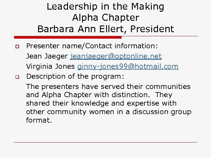 Leadership in the Making Alpha Chapter Barbara Ann Ellert, President o q Presenter name/Contact information: Jean Jaeger jeanjaeger@optonline. net Virginia Jones ginny-jones 99@hotmail. com Description of the program: The presenters have served their communities and Alpha Chapter with distinction. They shared their knowledge and expertise with other community women in a discussion group format.
