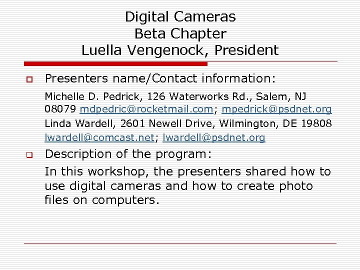 Digital Cameras Beta Chapter Luella Vengenock, President o Presenters name/Contact information: Michelle D. Pedrick, 126 Waterworks Rd. , Salem, NJ 08079 mdpedric@rocketmail. com; mpedrick@psdnet. org Linda Wardell, 2601 Newell Drive, Wilmington, DE 19808 lwardell@comcast. net; lwardell@psdnet. org q Description of the program: In this workshop, the presenters shared how to use digital cameras and how to create photo files on computers.