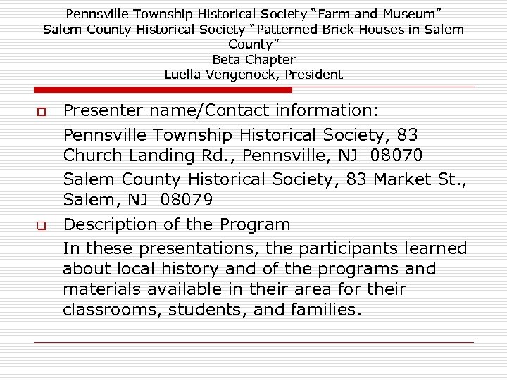 Pennsville Township Historical Society “Farm and Museum” Salem County Historical Society “Patterned Brick Houses in Salem County” Beta Chapter Luella Vengenock, President o q Presenter name/Contact information: Pennsville Township Historical Society, 83 Church Landing Rd. , Pennsville, NJ 08070 Salem County Historical Society, 83 Market St. , Salem, NJ 08079 Description of the Program In these presentations, the participants learned about local history and of the programs and materials available in their area for their classrooms, students, and families.