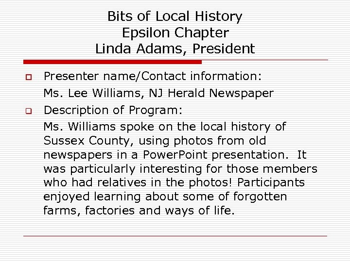 Bits of Local History Epsilon Chapter Linda Adams, President o q Presenter name/Contact information: Ms. Lee Williams, NJ Herald Newspaper Description of Program: Ms. Williams spoke on the local history of Sussex County, using photos from old newspapers in a Power. Point presentation. It was particularly interesting for those members who had relatives in the photos! Participants enjoyed learning about some of forgotten farms, factories and ways of life.