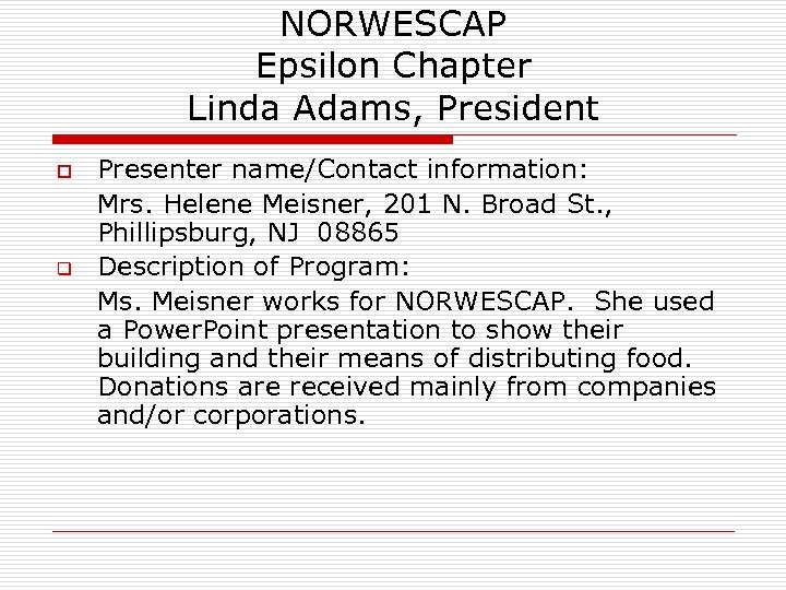 NORWESCAP Epsilon Chapter Linda Adams, President o q Presenter name/Contact information: Mrs. Helene Meisner, 201 N. Broad St. , Phillipsburg, NJ 08865 Description of Program: Ms. Meisner works for NORWESCAP. She used a Power. Point presentation to show their building and their means of distributing food. Donations are received mainly from companies and/or corporations.
