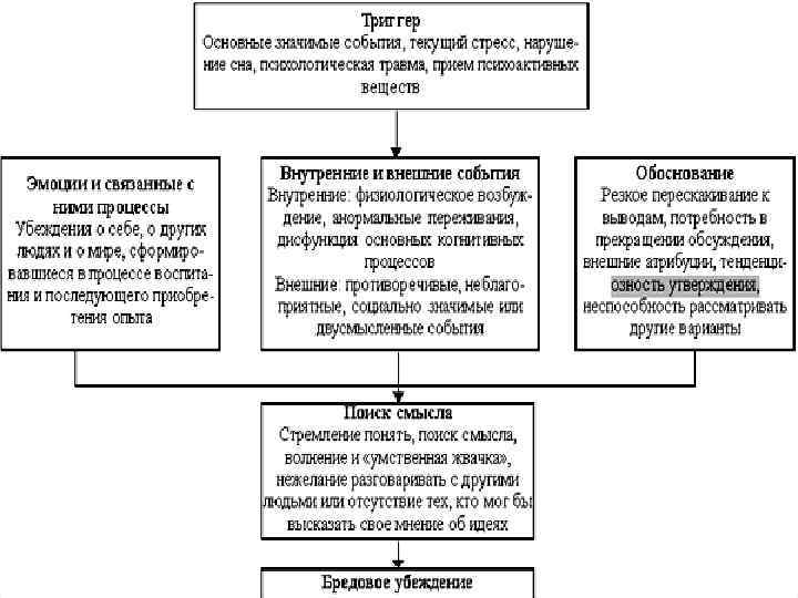 Критерии бреда: n следствие болезни n избыточность и несоответствие реальности, однако со стойкой убеждённостью в действительности; n отсутствие коррекции n выход за рамки существующих социально-культуральных особенностей n паралогичность; n сознание сохраняется ясным; n глубокие нарушения личности; n интеллект, как правило, сохранён или ослаблен