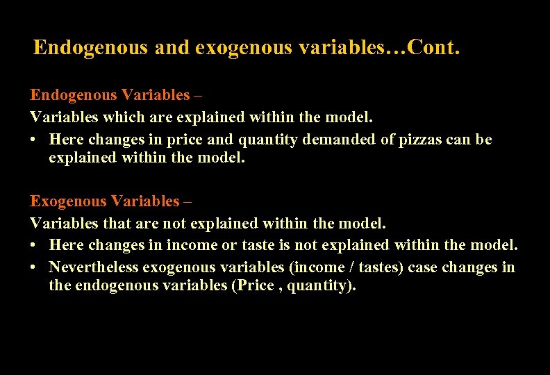 Endogenous and exogenous variables…Cont. Endogenous Variables – Variables which are explained within the model. • Here changes in price and quantity demanded of pizzas can be explained within the model. Exogenous Variables – Variables that are not explained within the model. • Here changes in income or taste is not explained within the model. • Nevertheless exogenous variables (income / tastes) case changes in the endogenous variables (Price , quantity).