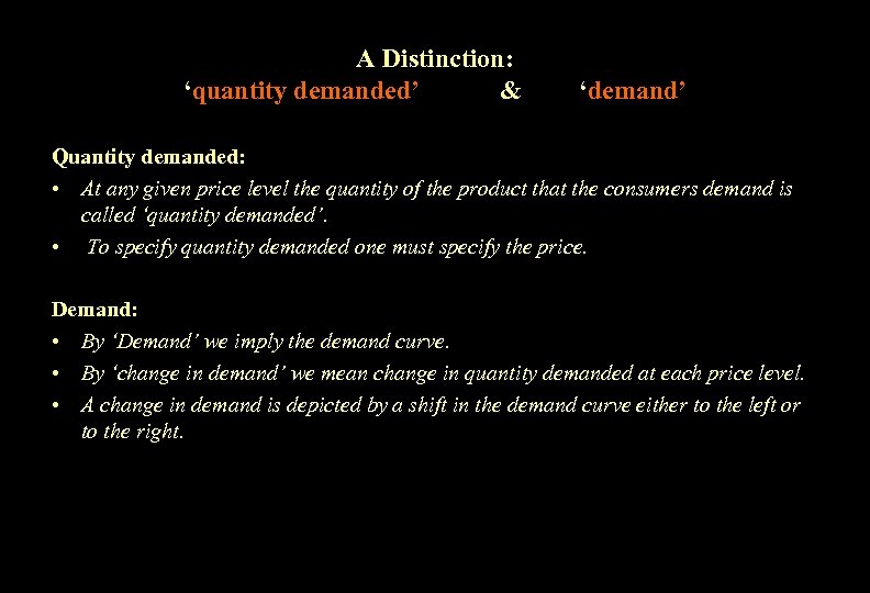 A Distinction: ‘quantity demanded’ & ‘demand’ Quantity demanded: • At any given price level the quantity of the product that the consumers demand is called ‘quantity demanded’. • To specify quantity demanded one must specify the price. Demand: • By ‘Demand’ we imply the demand curve. • By ‘change in demand’ we mean change in quantity demanded at each price level. • A change in demand is depicted by a shift in the demand curve either to the left or to the right.