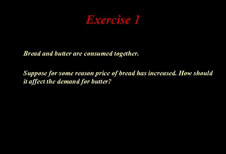 Exercise 1 Bread and butter are consumed together. an increase in the price of watches (b) Suppose for some reason price of bread has increased. How should it affect the demand for butter? a decrease in the price of watches