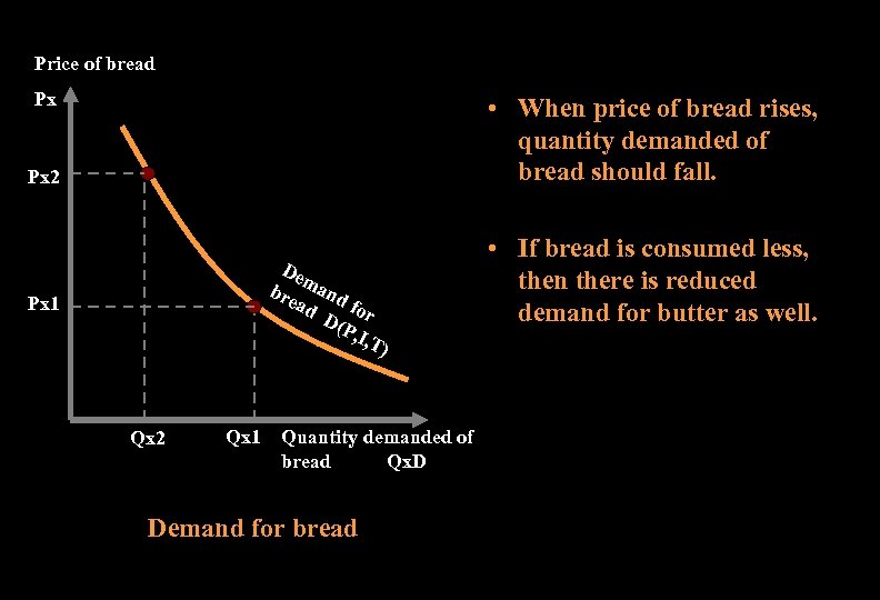 Price of bread Px • When price of bread rises, quantity demanded of bread should fall. Px 2 De m bre and ad f D(P or , I, T ) Px 1 Qx 2 Qx 1 Quantity demanded of bread Qx. D Demand for bread • If bread is consumed less, then there is reduced demand for butter as well.