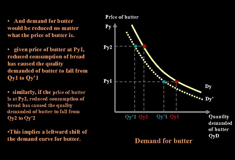 • And demand for butter would be reduced no matter what the price of butter is. • given price of butter at Py 1, reduced consumption of bread has caused the quality demanded of butter to fall from Qy 1 to Qy’ 1 Price of butter Py Py 2 Py 1 Dy • similarly, if the price of butter is at Py 2, reduced consumption of bread has caused the quality demanded of butter to fall from Qy 2 to Qy’ 2 • This implies a leftward shift of the demand curve for butter. Dy’ Qy’ 2 Qy’ 1 Qy 1 Demand for butter Quantity demanded of butter Qy. D