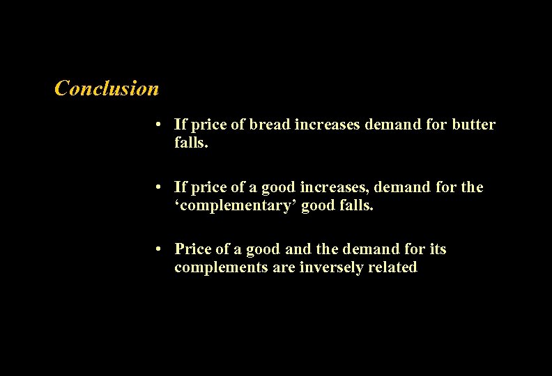 Conclusion • If price of bread increases demand for butter falls. • If price of a good increases, demand for the ‘complementary’ good falls. • Price of a good and the demand for its complements are inversely related