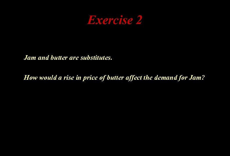 Exercise 2 Jam and butter are substitutes. How would a rise in price of butter affect the demand for Jam?
