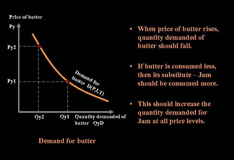 Price of butter Py • When price of butter rises, quantity demanded of butter should fall. Py 2 De m bu and tte r D for (P, I, T ) Py 1 Qy 2 Qy 1 Quantity demanded of butter Qy. D Demand for butter • If butter is consumed less, then its substitute – Jam should be consumed more. • This should increase the quantity demanded for Jam at all price levels.