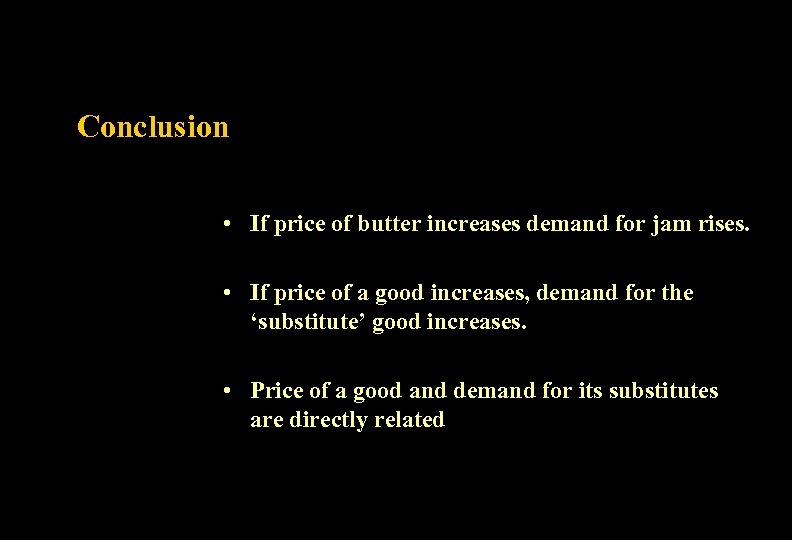 Conclusion • If price of butter increases demand for jam rises. • If price of a good increases, demand for the ‘substitute’ good increases. • Price of a good and demand for its substitutes are directly related