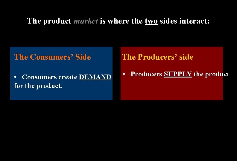 The product market is where the two sides interact: The Consumers’ Side The Producers’ side • Consumers create DEMAND for the product. • Producers SUPPLY the product