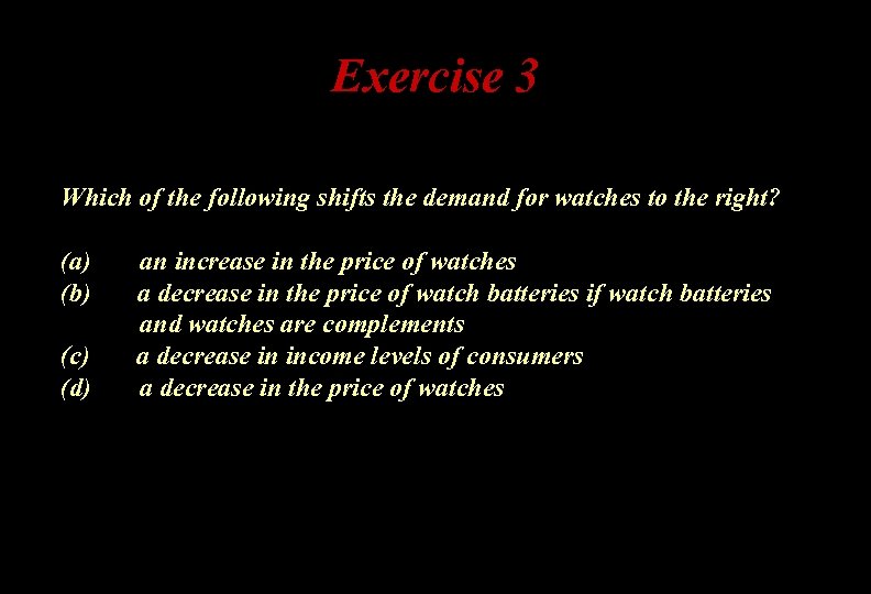 Exercise 3 Which of the following shifts the demand for watches to the right? (a) (b) (c) (d) an increase in the price of watches a decrease in the price of watch batteries if watch batteries and watches are complements a decrease in income levels of consumers a decrease in the price of watches