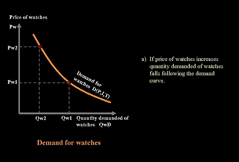Price of watches Pw Pw 2 a) If price of watches increases quantity demanded of watches falls following the demand curve. De m wa and tch es for D(P , I, T Pw 1 ) Qw 2 Qw 1 Quantity demanded of watches Qw. D Demand for watches
