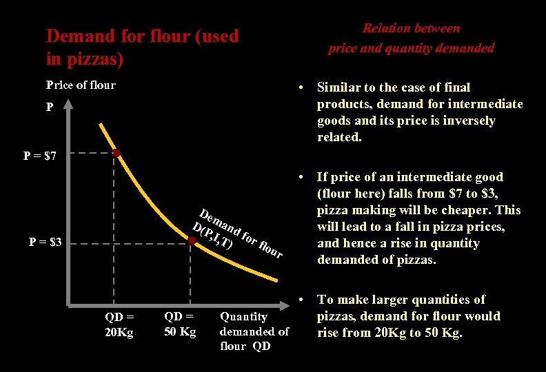 Relation between price and quantity demanded Demand for flour (used in pizzas) Price of flour • Similar to the case of final products, demand for intermediate goods and its price is inversely related. P P = $7 De m D(P and , I, T for flo ) u P = $3 r QD = 20 Kg QD = 50 Kg • If price of an intermediate good (flour here) falls from $7 to $3, pizza making will be cheaper. This will lead to a fall in pizza prices, and hence a rise in quantity demanded of pizzas. • To make larger quantities of pizzas, demand for flour would Quantity demanded of rise from 20 Kg to 50 Kg. flour QD