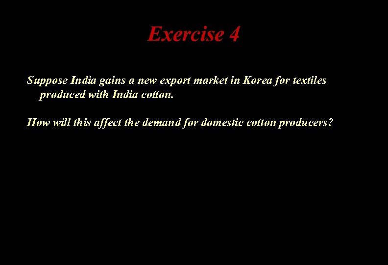 Exercise 4 Suppose India gains a new export market in Korea for textiles produced with India cotton. How will this affect the demand for domestic cotton producers?