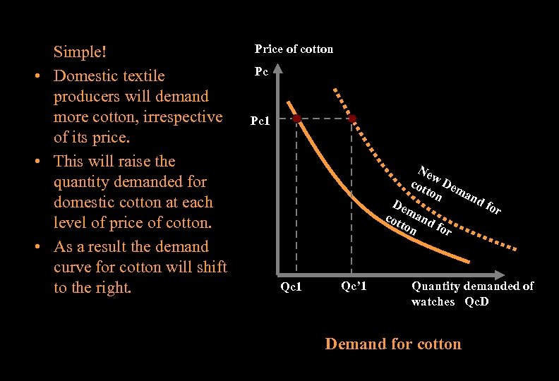 Simple! • Domestic textile producers will demand more cotton, irrespective of its price. • This will raise the quantity demanded for domestic cotton at each level of price of cotton. • As a result the demand curve for cotton will shift to the right. Price of cotton Pc Pc 1 Ne w cot Dem ton and De for ma cot ton nd fo r Qc 1 Qc’ 1 Quantity demanded of watches Qc. D Demand for cotton
