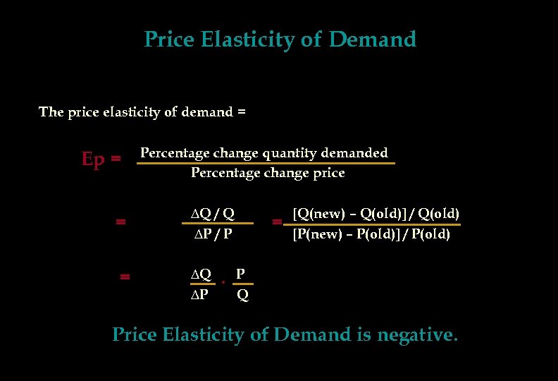 Price Elasticity of Demand The price elasticity of demand = Ep = Percentage change quantity demanded Percentage change price = ∆Q / Q ∆P / P = ∆Q ∆P . = [Q(new) – Q(old)] / Q(old) [P(new) – P(old)] / P(old) P Q Price Elasticity of Demand is negative.