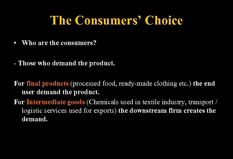 The Consumers’ Choice • Who are the consumers? - Those who demand the product. For final products (processed food, ready-made clothing etc. ) the end user demand the product. For Intermediate goods (Chemicals used in textile industry, transport / logistic services used for exports) the downstream firm creates the demand.
