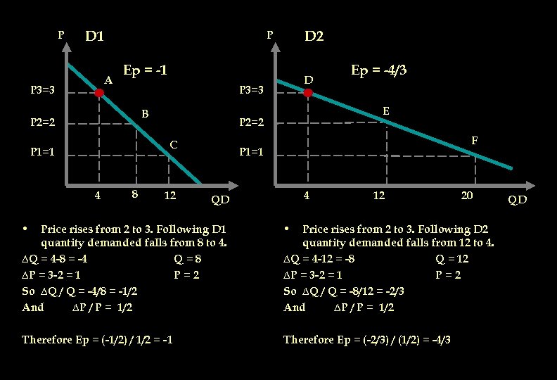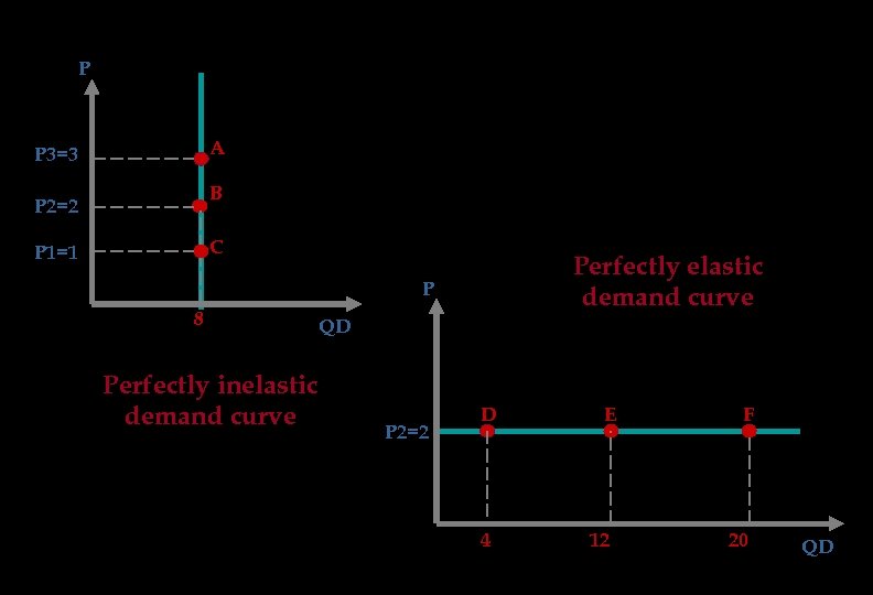 P A P 3=3 B P 2=2 C P 1=1 Perfectly elastic demand curve P 8 QD Perfectly inelastic demand curve P 2=2 D 4 E 12 F 20 QD