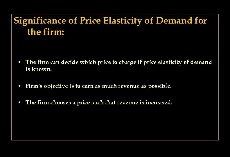 Significance of Price Elasticity of Demand for the firm: • The firm can decide which price to charge if price elasticity of demand is known. • Firm’s objective is to earn as much revenue as possible. • The firm chooses a price such that revenue is increased.