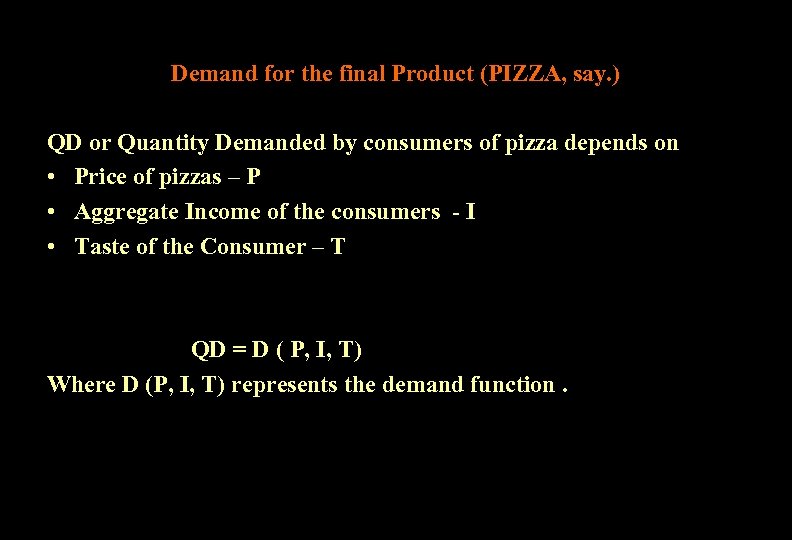 Demand for the final Product (PIZZA, say. ) QD or Quantity Demanded by consumers of pizza depends on • Price of pizzas – P • Aggregate Income of the consumers - I • Taste of the Consumer – T QD = D ( P, I, T) Where D (P, I, T) represents the demand function.