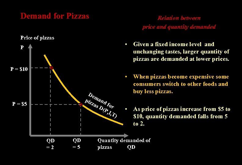 Demand for Pizzas Relation between price and quantity demanded Price of pizzas • Given a fixed income level and unchanging tastes, larger quantity of pizzas are demanded at lower prices. P P = $10 De m piz and zas f D(P or , I, T ) P = $5 QD =2 QD =5 • When pizzas become expensive some consumers switch to other foods and buy less pizzas. • As price of pizzas increase from $5 to $10, quantity demanded falls from 5 to 2. Quantity demanded of pizzas QD