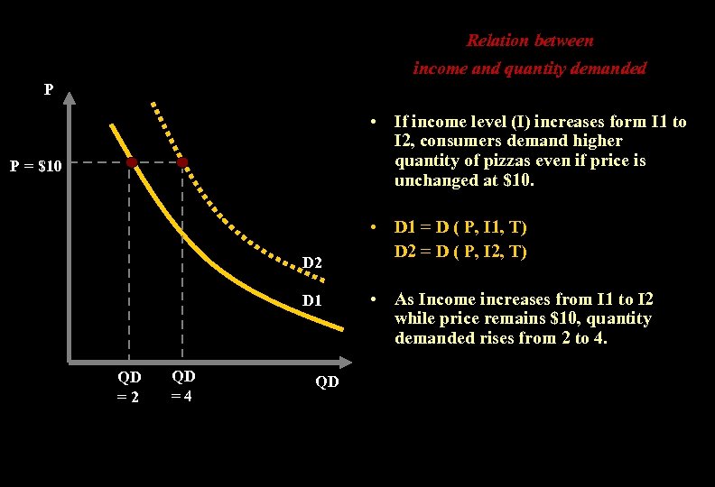 Relation between income and quantity demanded P • If income level (I) increases form I 1 to I 2, consumers demand higher quantity of pizzas even if price is unchanged at $10. P = $10 D 2 D 1 QD =2 QD =4 QD • D 1 = D ( P, I 1, T) D 2 = D ( P, I 2, T) • As Income increases from I 1 to I 2 while price remains $10, quantity demanded rises from 2 to 4.
