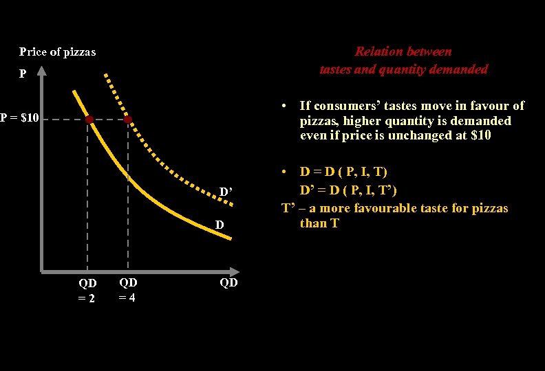 Relation between tastes and quantity demanded Price of pizzas P • If consumers’ tastes move in favour of pizzas, higher quantity is demanded even if price is unchanged at $10 P = $10 D’ D QD =2 QD =4 QD • D = D ( P, I, T) D’ = D ( P, I, T’) T’ – a more favourable taste for pizzas than T