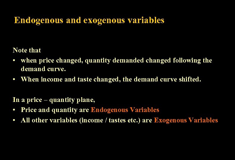 Endogenous and exogenous variables Note that • when price changed, quantity demanded changed following the demand curve. • When income and taste changed, the demand curve shifted. In a price – quantity plane, • Price and quantity are Endogenous Variables • All other variables (income / tastes etc. ) are Exogenous Variables