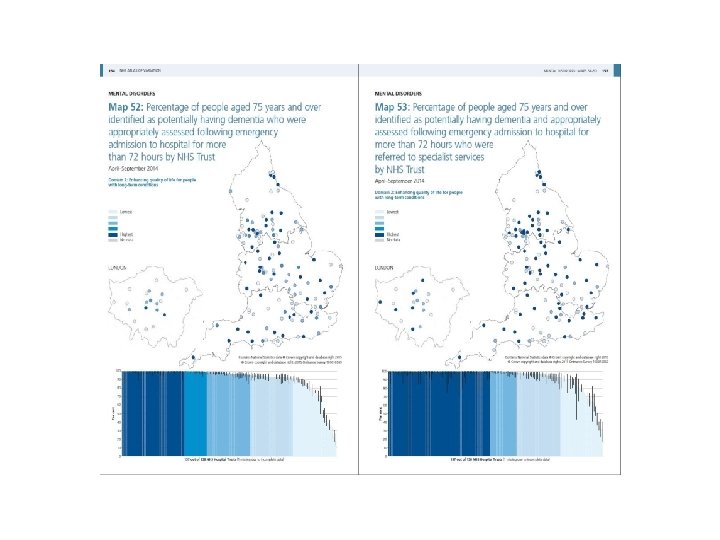 Dementia Data Harmonisation • CCG performance Aug 2015: • Lowest High Weald Lewes Havens 54. 4% • Best Horsham and Mid-Sussex 67. 1% • Majority improving their position from 0. 5% - 12. 8% • All CCGs have submitted their Dementia plans with trajectory to meet the dementia ambition by Mar 2016 • Most CCGs put in place contractual variance for memory assessment services so ALL pts seen and diagnosed within 12 wks