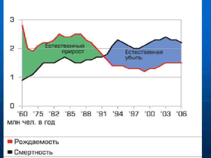 Демографическая обстановка в России. Россия вступила в период быстрого снижения ежегодной рождаемости. Совершенно очевидно, что если в ближайшие годы не удастся переломить эти тенденции, то Россию ожидает гораздо больший демографический «провал» , чем в 60 -е годы, со всеми вытекающими отсюда последствиями: диспропорциями на брачном «рынке» , спадом численности трудовых ресурсов и т. д.