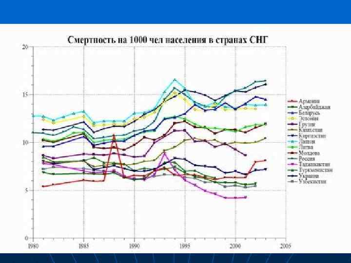 Динамика численности населения и его естественное движение в России Год Численнос тьнасе лен, млн чел. 1980 138, 8 1990 Годовой естественный прирост или убыль (-) населения, млн чел Естественное движение населения Рожда емо сть, ‰ Смерт нос ть, ‰ Естественн ый прирост, ‰ 800 15, 9 11, 0 4, 9 147, 7 333 13, 4 11, 2 2, 2 1991 148, 2 104 12, 1 11, 4 0, 7 1992 148, 3 -220 10, 7 12, 2 -1, 5 1993 148, 3 -750 9, 4 15, 5 -6, 1 1994 148, 0 -890 9, 6 15, 6 -6, 0 1995 147, 9 -840 9, 3 15, 0 -5, 7 1996 147, 6 -775 8, 9 14, 2 -5, 3 1997 147, 1 -755 8, 6 13, 8 -5, 2 1998 146, 7 -705 8, 8 13, 6 -4, 8