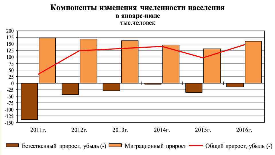 Согласно официальной статистике, с 2010 года в государстве отмечается медленный, но стабильный прирост численности граждан. К январю 2016 года в РФ постоянно проживали 146 544 710 человек, что на 0, 19% больше, чем было на 1 января 2015 года. С начала года число жителей России возросло на 146, 3 тыс. человек, или на 0, 1% (на соответствующую дату предыдущего года также наблюдалось увеличение численности населения на 96, 2 тыс. человек, или на 0, 07%). Естественная убыль населения в январе-июле 2016 г. сократилась по сравнению с соответствующим периодом 2015 г. на 21, 5 тыс. человек. Миграционный прирост полностью компенсировал численные потери населения и обеспечил прирост численности населения страны.