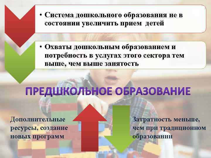 • Система дошкольного образования не в состоянии увеличить прием детей • Охваты дошкольным образованием и потребность в услугах этого сектора тем выше, чем выше занятость Дополнительные ресурсы, создание новых программ Затратность меньше, чем при традиционном образовании