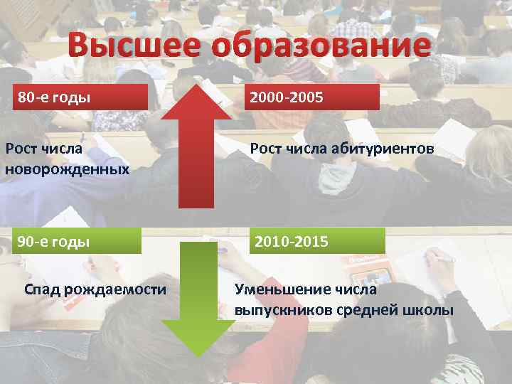 Высшее образование 80 -е годы Рост числа новорожденных 90 -е годы Спад рождаемости 2000 -2005 Рост числа абитуриентов 2010 -2015 Уменьшение числа выпускников средней школы