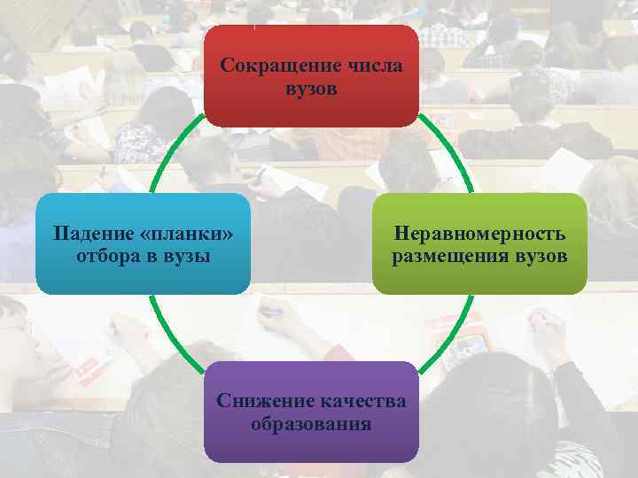 Сокращение числа вузов Падение «планки» отбора в вузы Неравномерность размещения вузов Снижение качества образования