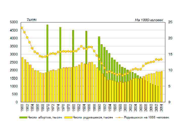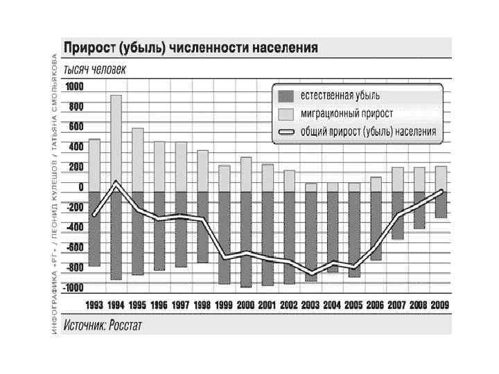 Естественное движение населения России, (в ‰) Годы Рождаемость Смертность Естественный прирост 1960 23, 2 7, 4 15, 8 1980 15, 9 11, 0 4, 9 1990 13, 4 11, 2 2, 2 1991 12, 1 11, 4 0, 7 1992 10, 7 12, 2 -1, 5 2000 8, 7 15, 3 - 6, 6 2005 10, 2 16, 1 - 5, 9 2008 12, 1 14, 6 - 2, 5 2009 12, 4 14, 2 -1, 8 2012 14, 7 13, 3 1, 4