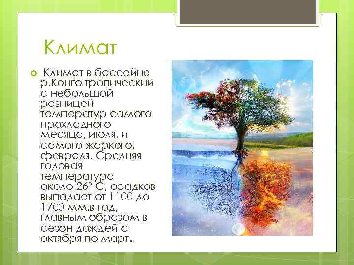 Климат в бассейне р. Конго тропический с небольшой разницей температур самого прохладного месяца, июля, и самого жаркого, февраля. Средняя годовая температура – около 26° С, осадков выпадает от 1100 до 1700 мм. в год, главным образом в сезон дождей с октября по март.