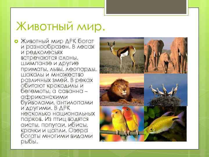 Животный мир ДРК богат и разнообразен. В лесах и редколесьях встречаются слоны, шимпанзе и другие приматы, львы, леопарды, шакалы и множество различных змей. В реках обитают крокодилы и бегемоты, а саванна – африканскими буйволами, антилопами и другими. В ДРК несколько национальных парков. Из птиц водятся аисты, попугаи, ибисы, крачки и цапли. Озера богаты многими видами рыбы.